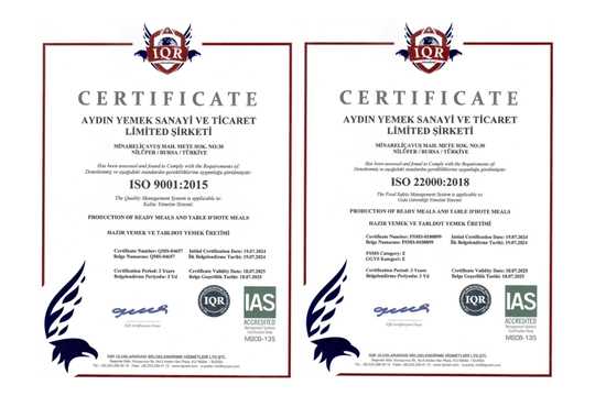 Kalite bizim için sadece bir hedef değil, aynı zamanda günlük çalışma disiplinimizin temelidir. Üretim süreçlerimizde ulusal ve uluslararası kalite standartlarını esas alıyor, tüm faaliyetlerimizi belgeli kalite yönetim sistemlerine göre sürdürüyoruz. Sahip olduğumuz ISO 9001 (Kalite Yönetim Sistemi), ISO 22000 (Gıda Güvenliği Yönetim Sistemi), HACCP ve TSE sertifikaları ile süreçlerimizin şeffaflığı ve güvenirliği belgelenmiştir. Kullandığımız hammaddelerden, üretim ekipmanlarına; personel hijyeninden, taşıma araçlarına kadar her adım düzenli olarak denetlenmektedir. Menülerimiz, gıda mühendisleri ve diyetisyenler eşliğinde hazırlanmaktadır. Denetim raporlarımız, müşteri talebine göre paylaşılabilir niteliktedir. Müşterilerimize sadece lezzet değil, aynı zamanda güven sunuyoruz.